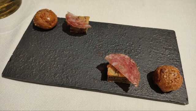 チーズをシューで包んだものと、サラミを載せたもの。