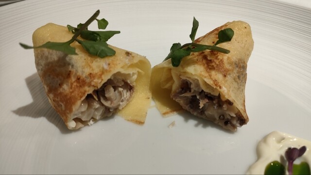 クレープ生地で秋刀魚、きのこ、無花果が巻かれている。