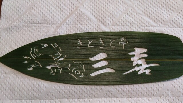 先に食べていた隣のテーブルのお客さんが、お刺身定食の皿に乗っていたお店の名前をくり抜いてある笹を持ち帰りたいと店員さんに言っているのを聞き、私も持ち帰りたい!ということで会計の時にお店の方に伝えたところ、洗ってビニール袋に入れてくださりました!ありがとうございました。家に帰ってキッチンペーパーでそっと水気を取り、記念に取ってあります!