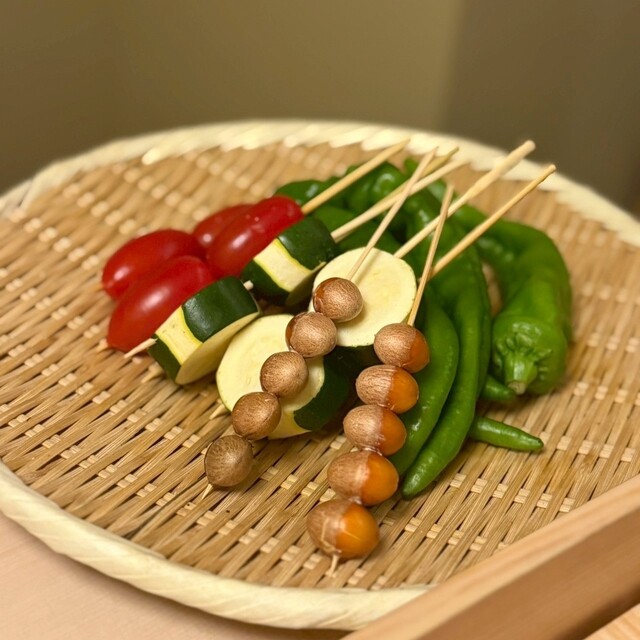 コース後半には、大きな籠に盛られた野菜や希少部位がテーブルへ。好みの串を目で見て選べる趣向が楽しく、特別感があります。