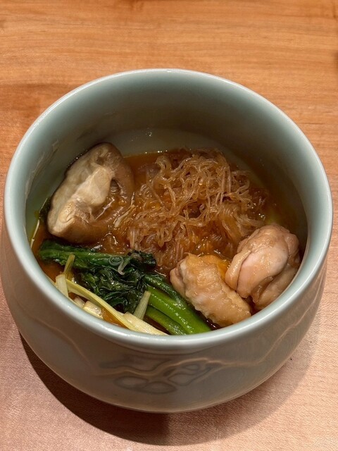海老はぷりっとした弾力と甘みが際立ち、ささみには出汁が隅々まで染みています。金糸瓜が全体をまとめ、やさしい旨味の調和が楽しめます。
