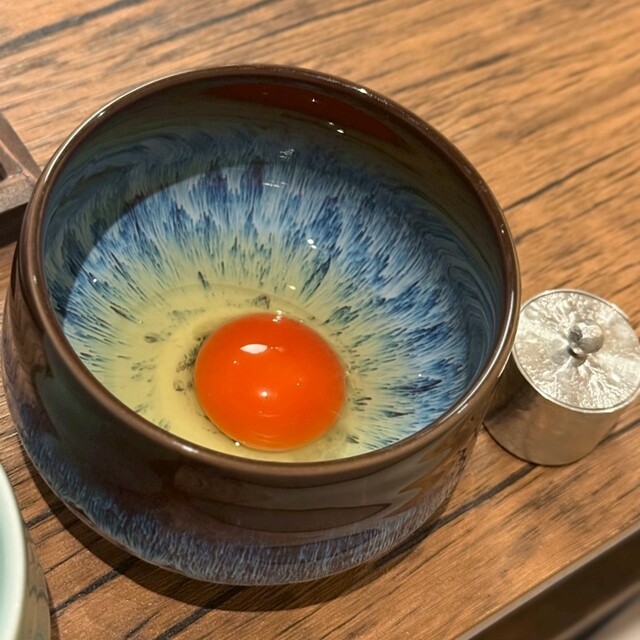 鶏すき焼きの旨味を余すことなく生かした贅沢な一皿。山梨県産卵の鮮やかな黄身がコクを加え、二層の旨味を構築しています。