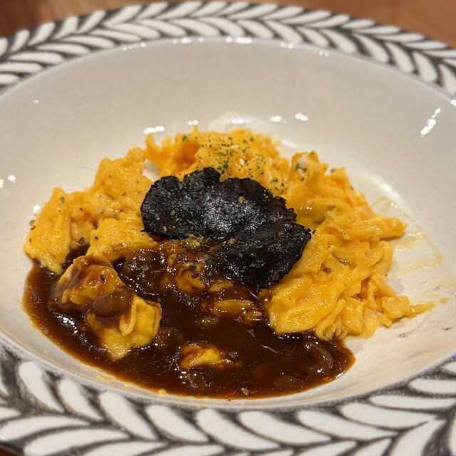 ふわりとほどける卵にバターの香りが広がり、控えめなデミグラスが上品。トリュフ塩の余韻が心地よく続きます。