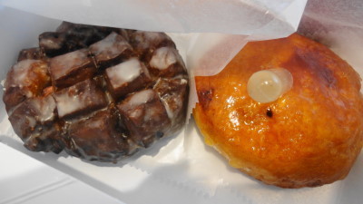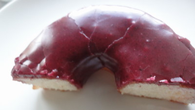 ブルーベリーバーボンバジルリング(380円)は、このお店の代表的なドーナツだそうで、ブルーベリーをピューレ状にしてフレッシュバジルとバーボンで香りづけしたドーナツ。