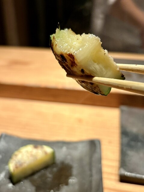 水茄子のシャキッとした食感、梅と大葉の爽やかさ、名古屋コーチンの脂身が三位一体。