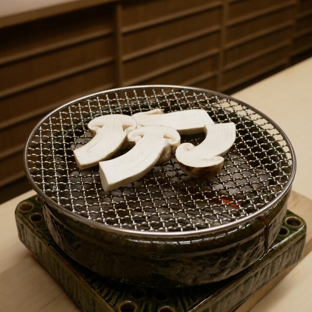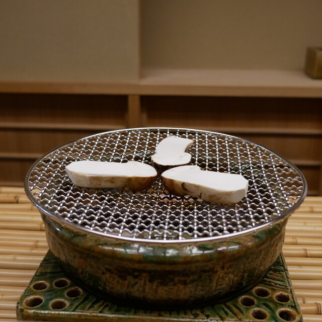 遠赤外線で焼かれた松茸は、炭で焼かれた香りがほのかに感じ、香り高く、コリコリとした歯ごたえと食感を味わいました。