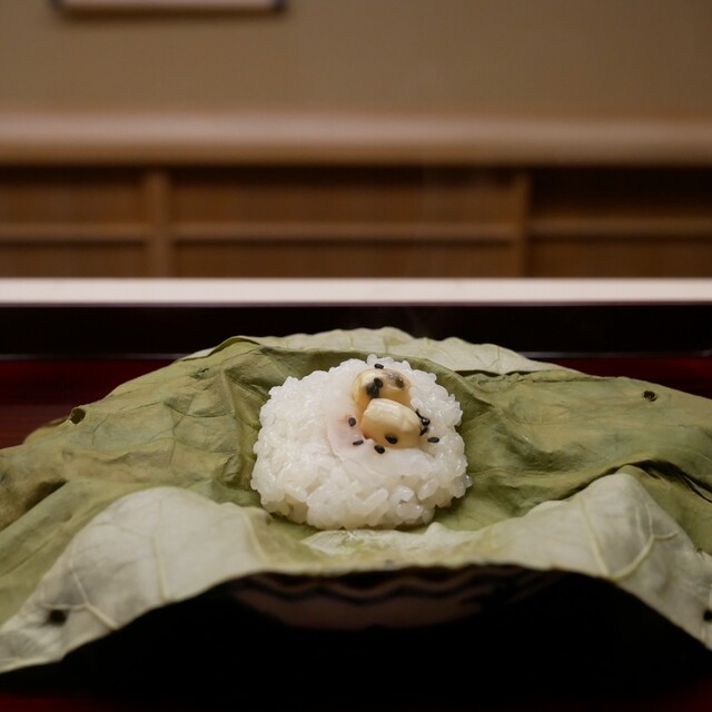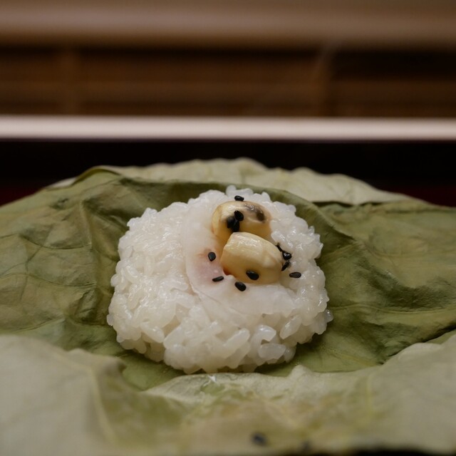 ○蓮の葉の飯蒸し 新蓮根と蓮の実
