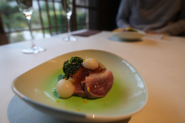 白いお皿にアートのように盛られた鴨と野菜、そしてまろやかなソース。