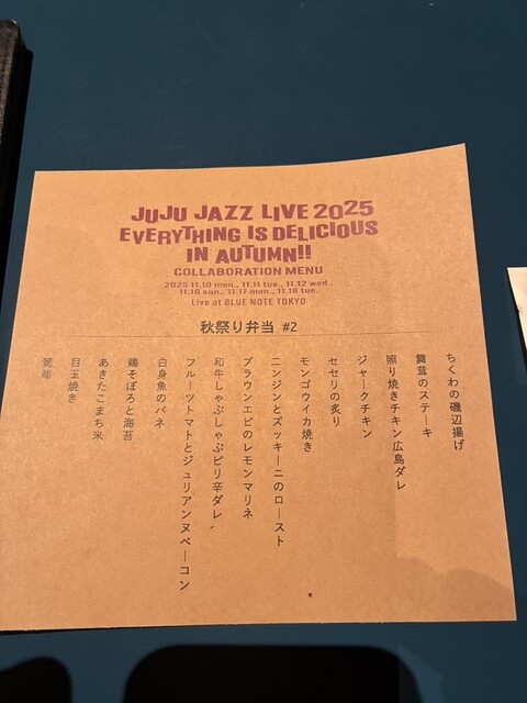 待ちに待ったJUJUさんのジャズライブに行って来ました。狭いドアを開けて秘密基地のような地下に降りていくところからワクワクです。前のめり過ぎて呼ばれる順番は後の方なのに、ドア前にスタンバイ(笑)ようやく席に案内されましたが、まずはお目当ての秋祭り弁当の確保をお願いしました。了解ですとのことで一安心(^^)ゆっくり会場を見渡しつつ飲み物を選びます。スペシャルドリンクがいくつもありましたがノド渇いていたのでビールにしました。しばし待つとお弁当が到着!開けてみてぎっしり詰まった内容に思わず歓声飲み物が到着して、ひとしきり撮影タイム。どれもこれも美味しくライブが始まる前のひとときを楽しめました。そしてJUJUさんの登場小粋に繰り出されるジャズソングとMCお腹も心も満たされた南青山の夕べでした。チケットをゲットしてくれた友人、同席してくれた友人たちにも感謝です。