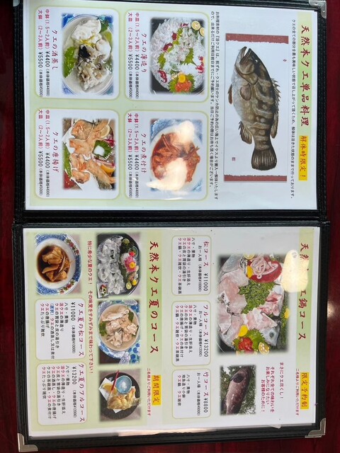 なかなか食べられるお店がないので、ここは奮発して、クエのフルコースを注文しました。唐揚げ、刺身、煮付け、鍋など堪能しました。コラーゲンがたっぷり過ぎて、最後は唇が引っ付いてしまいました。伊勢海老の生け簀もありました。
