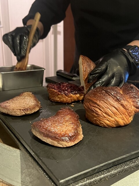 クロワッサンのステーキサンドは丸く焼いたクロワッサンにその場でステーキを挟んでくれるのですが、サクッとした食感とバターの風味の後に、柔らかーいお肉の美味いきて、これは最高!うまっ