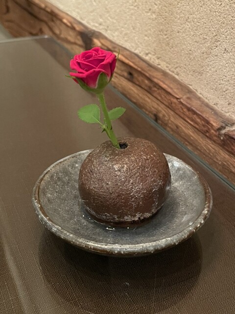 テーブルの上にバラが一輪飾られている