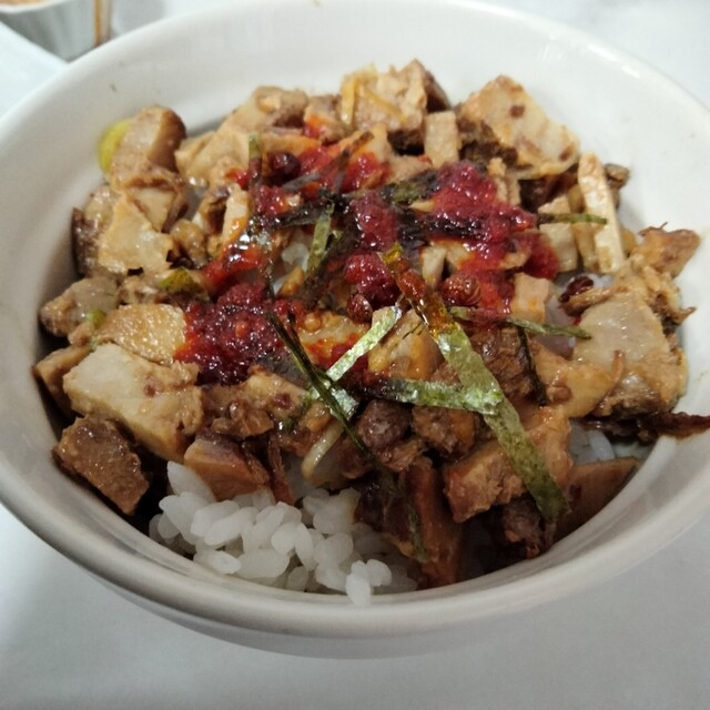 正油ラーメンかつおの粉入り、チャーシュー丼