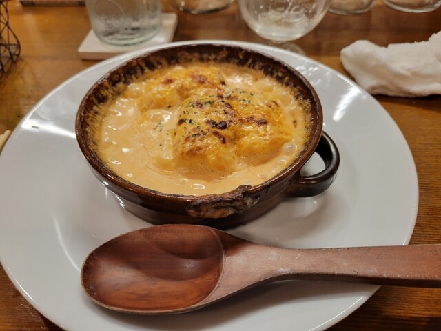 6時の開店と共に入店、なんかいつも落ち着くな。今日は大好きなビールが飲めないけれど温かい烏龍茶をいただきました。今日は体調を考えながらLightに行きましょうか。と言いながらいつも大好きな「お肉屋さんのサラダ」はボリーム満点。大好きなパテにいろんなハムにパリパリの野菜達が本当に抜群に美味い。毎回これを食べただけで幸せな気分になってしまいます。温かいのが良いのでオニオングラタンスープも一つだけ頼んでシェア。大好きなこちらのバゲットもいただいたので早くもお腹が膨れて来た。でももう一品はポテトとビックなベーコンの焼物。肉好きな妻にベーコンを譲りポテトをいただくもこれも美味いな。でももう限界、今日はこれ以上無理だ。