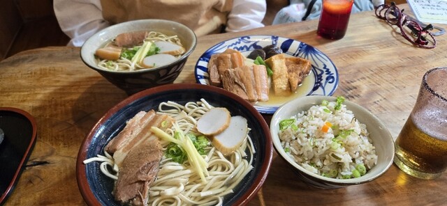 首里城公園にはもう何度も来ているけれど、ずっと来ようと思っていたのになかなか来れなかったこちらのお店へようやく訪れることが出来ました。金曜日のお昼時に到着すると既に一巡目のお客さんが入っており何組か待つことに。でも回転が早いので割りと早く座席に着けました。素朴だけど品格を感じる店内に感じの良いお母さん達がキビキビと働いていらっしゃいます。妻と私、お目当ての首里そばはもちろん頼むけど三枚肉の入った煮付けやジューシー、そしてビールも頼みました。まずそばがやって来ましたがズバリ美味すぎます。今まで食べた麺と全く違い少し固めでまるで腰のある蕎麦のよう。汁もとても上品だしお肉も癖無く柔らかく調理されている。沖縄そばの概念が変わるような逸品です。同じく煮付けも同様に上品な味付け。大根は柔らかくなり過ぎていないのに味が染みている。ジューシーもこれまた同様に逸品でした。こんなにレベルが高くそして人気店にもかかわらずお値段が安い。ビールを入れても2人でなんと2300円とはあり得ないでしょう。とても次元の高いお店に出会うことが出来て幸せです、ありがとうございました。
