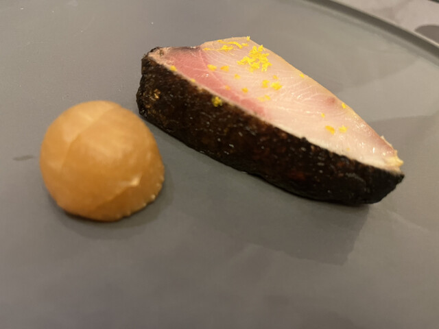 シマアジは、急速冷凍かけてから薪の薫りを纏わせて皮だけはパリっと