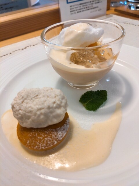 米粉の焼きドーナツの上はもったりしたヨーグルトとチーズクリームが混ざったようなクリームで、まわりはホワイトチョコのソース!!めちゃ手が込んだデザート二種盛りで大満足(≧∀≦)