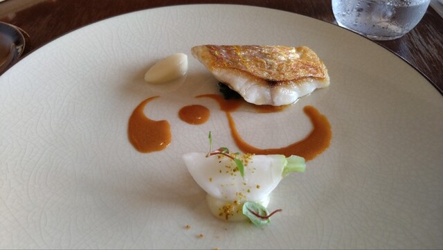 ○お魚料理:イトヨリのポワレ、オマールエビのソース、根セロリのピューレ、カブの下は貝類のお出汁とニンニクを合わせたソース
