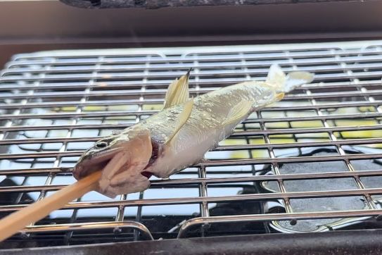見てくださいこの美しい鮎。背びれに白い点々がくっきり。これをちょい残酷ですが、ロースターで焼いていただきます。5分ほどでひっくり返してとか店員さんの細かい指示通りにするとうまく焼けました。ここの鮎は内臓までうまく、ストレスなくいただきました。田舎風の手打ち蕎麦と蕎麦つゆは最高でした。近くにキャンプ場も賑わってましたが、お昼は絶対ここに来たいと思わせる蕎麦屋です。