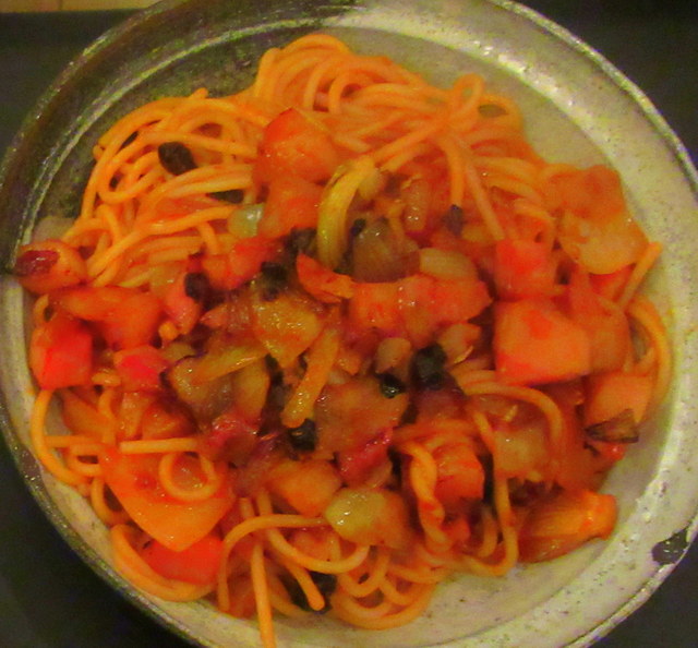 あと、ナポリタンスパゲティと野菜のチーズソースを作りました。連れにワインのセレクトを任せて、さあ宴会開始です。