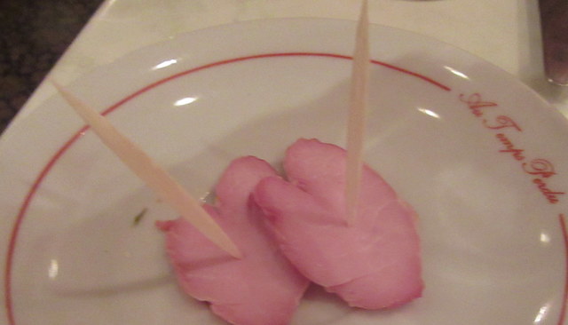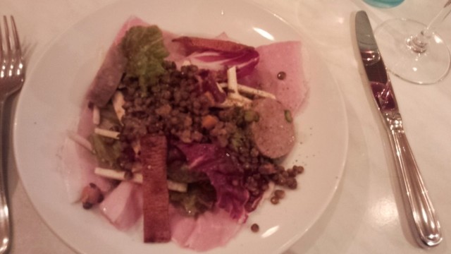さて、前菜は豚のハム・ソーセージ・バラ、そして盛り合わせを。主菜には仔牛のクリーム煮と鴨のローストをいただきます。