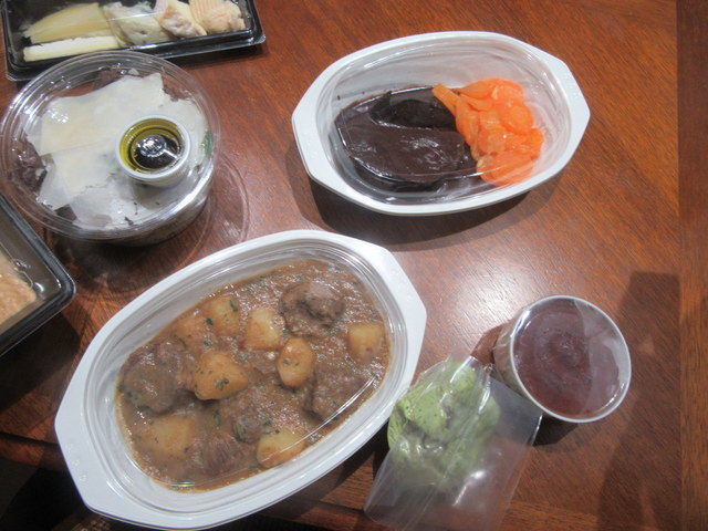 購入したのは、冷たいのがローストビーフサラダ、フォアグラのテリーヌ、トマトと海老のサラダ。温めるのが牛頬肉ワイン煮込み、エスカルゴ、クネル、そして仔羊のシチュー。