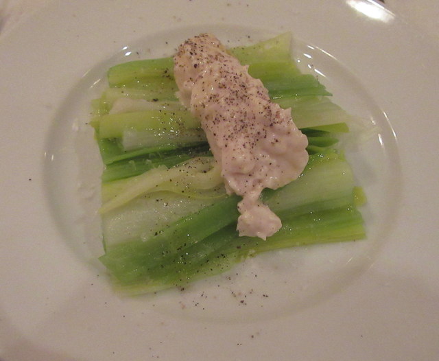 前菜は、ポロ葱の温製と前菜盛り合わせ。ポロ葱はかすかな苦みを活かしたソースがいいですね。盛り合わせはもうお皿にはみでんくらいに盛っていただいています。「まあ、今日はこれで最後のお客様ですから」ということで松井さんのご厚意に感謝。そして、どの品もきちんと作り込まれたお料理ばかりです。