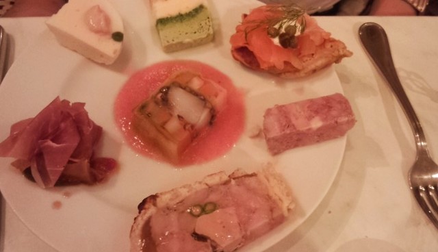 そして盛あわせはどどんと7種、オマール海老のテリーヌ、三色のテリーヌ、野菜のテリーヌ、パテアンクルート、生ハム、スモークサーモン、フォアグラ。うーんどれから食べようか、迷いにまよう、アップテンポの一皿。