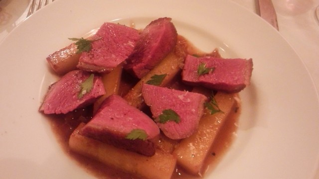 メインの仔牛はクリームソースがとろけますね。お肉は柔らかくて食べやすい。そして鴨!しっかりとした輪郭の味付け、付け合わせの大根にもいい味が乗りうつっております。