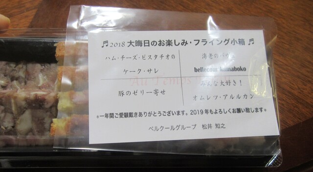 我々の年末恒例行事の一つが、こちらにて予約していたベルクールグループの総力を挙げたフレンチおせちを受け取ることであります。店頭で「松井さんによろしくお伝えください」と連れが申し上げると、お店の方が「松井、いまおりますよ、呼んできます」とのこと。