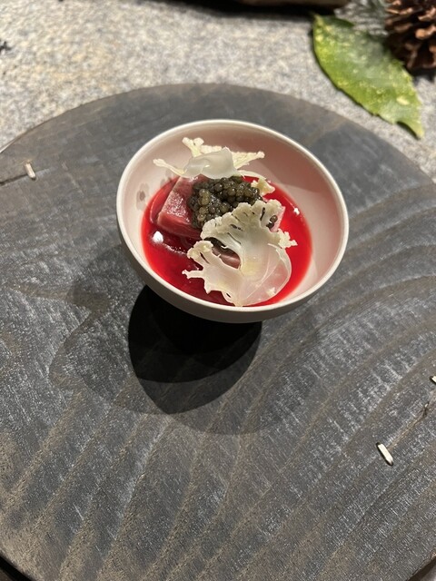 雲丹と青のりのメレンゲの料理は口に入れた瞬間メレンゲが解けて青のりの風味と雲丹が結びつく印象的な料理でした、キャビアの塩気と一緒に食べる赤身もよかった。