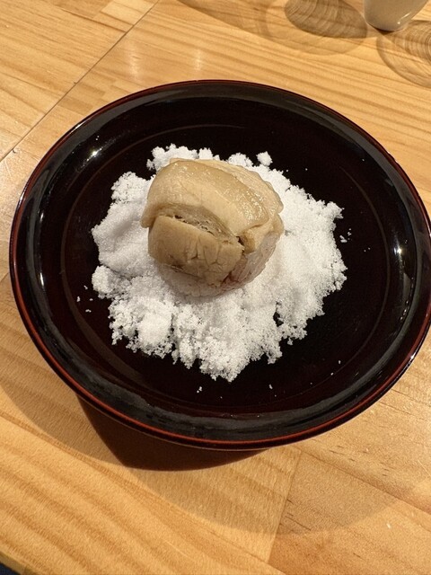 味わいもさることながら、創意工夫がかっこよく感動的でした。紹興酒に2時間程度漬けたホタテの貝柱の味付けに同じく紹興酒に漬けた青のり。