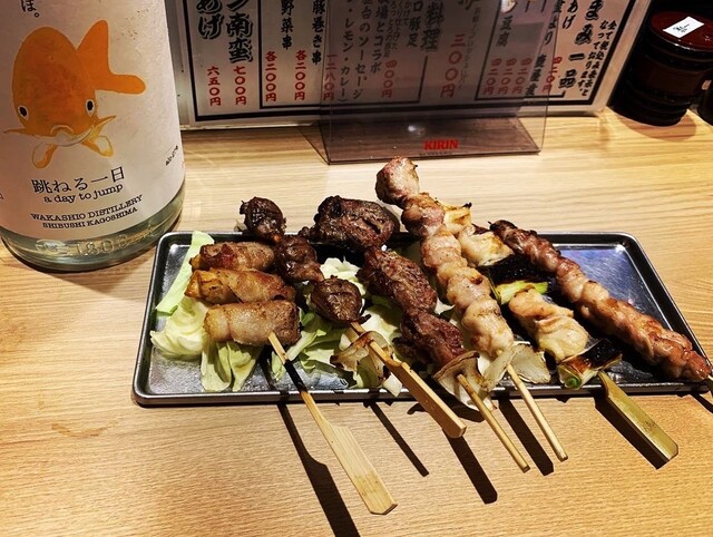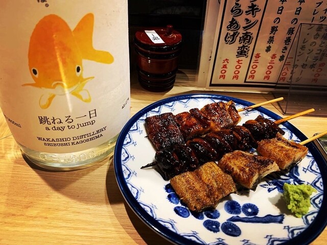 今回は、うなぎ3本串セット、地鶏の刺身、ドイツ屋台のソーセージ、焼鳥串、デメハイ(跳ねる一日の炭酸割り)にしました⤴⤴⤴(跳ねる一日は、ゆずを使用したお酒です♪ )