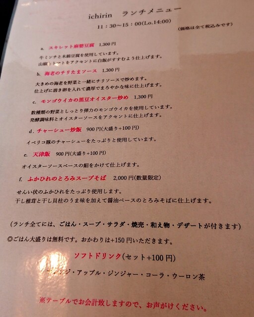 (ランチ全てには、ごはん・スープ・サラダ・焼売・和え物・デザートが付きます)◎ごはん大盛りは無料です。おかわりは+150円いただきます。ソフトドリンク(セット+100円)オレンジ・アップルジンジャー・コーラ・ウーロン茶
