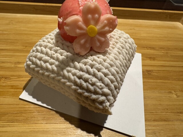 モンブランジャポネは、パティシエの代表作!ニットのようなテクスチャに、桜の花を模した飾りが⭐︎細かい技術が光っています!