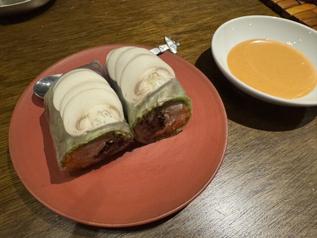 きのこ12種類使った自湯・紅湯スープの火鍋、生春巻き、春巻きなど喜乃胡コース ¥4800をいただきました。