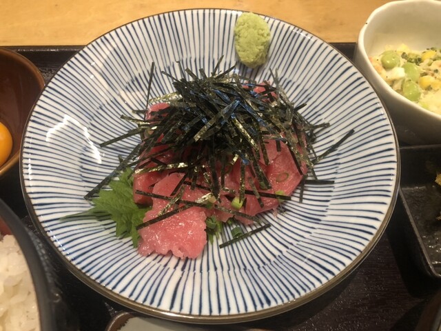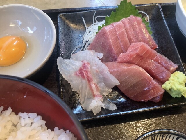 朝〆のお刺身、新鮮!鯛は歯応えがしっかり。マグロは脂のノリが最高で、程よい赤身感と脂感。まずは醤油、そして途中からは黄身でトロッといきます。