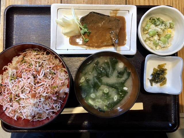しらす丼はたっぷりのシラスに、カリ梅、高菜、ゴマなどで味付けしてあります。シラスの量も素晴らしいけど、さりげなくしっかりと手が入ってるのがなんとも嬉しいですね。