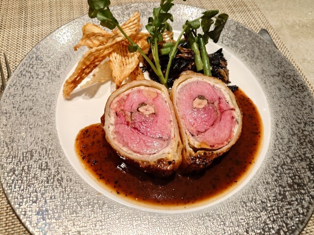 切って一口食べた瞬間、フォアグラとソース、肉とパイの間の鶏のムースの旨味がまずダイレクトに伝わってきます。