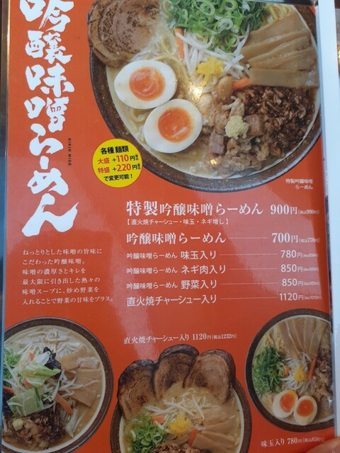 吟醸味噌ラーメン直火焼きチャーシュー入り(1375円)