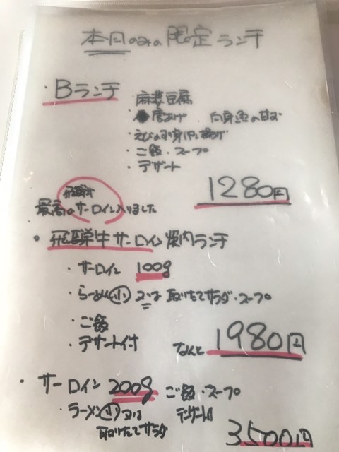 ある日に、「最高のサーロイン入りました」と書かれた特別メニュー