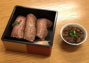 網焼き寿司3貫、しぐれ煮、飛騨牛サーロインステーキ100g、ごはん、味噌汁。