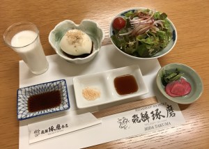 飛騨の牛乳、豆腐、サラダ、漬物、冷製ローストビーフ、牛串、