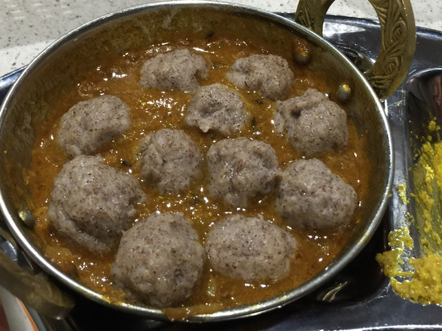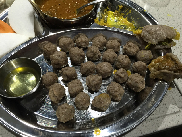 デロの団子をマトンカレーに沈めました。間違った食べ方なので、マネしないでください。