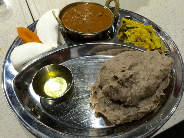 ダルバート定食A。一番上にあるスープが、豆のスープ(ダル)です。
