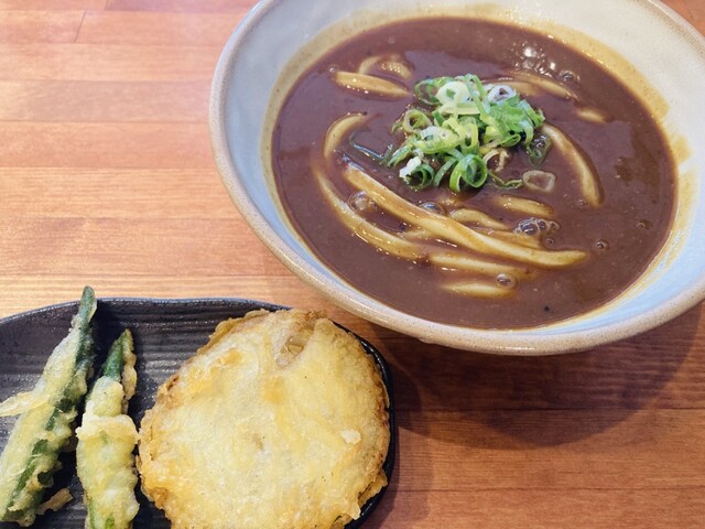 私は直前まで悩んでいたカレーうどんに日替わりの天ぷら。(この日はタマネギとオクラ)