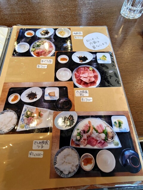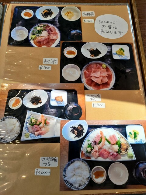 注文したのは、さしみ定食のつると松、マグロ丼の3種類です。正直、私には、さしみ定食の松で十分な量でした。