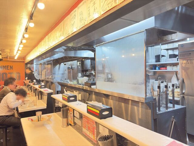 厨房と麵場を臨む7番カウンターに着席し、ホール担当Nさんが注文を確認。