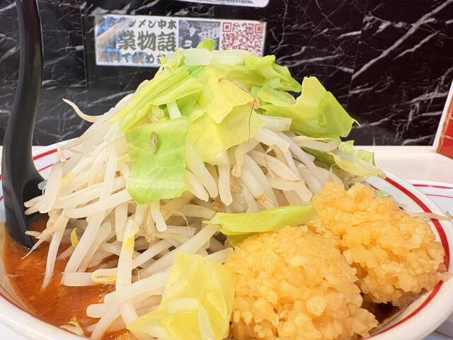中本の醤油ダレにあごだしを合わせた特製醤油ダレを使用し、中本のベーススープと専用に作られた特製ラー油、クラッシュニンニクを加えた、中本では珍しい醤油系の辛めスープ。