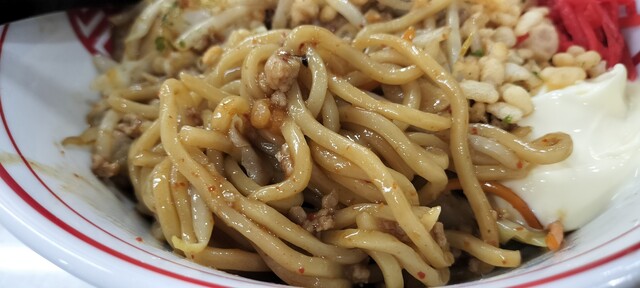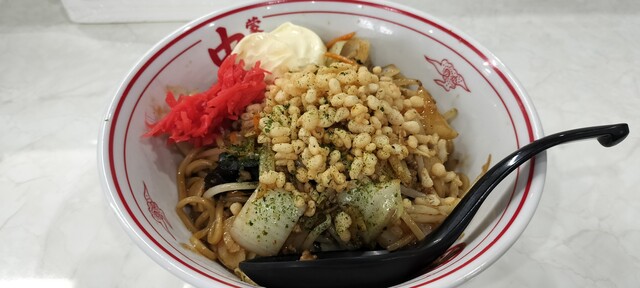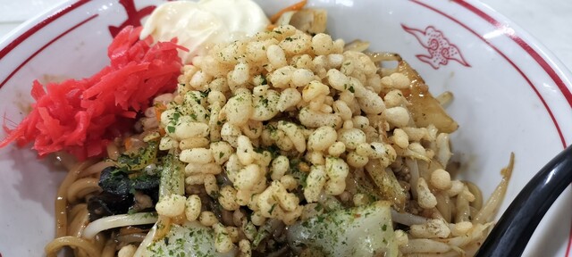 焼きそばはソースの味わいと、ちょっとしたピリ辛です。揚げ玉や紅ショウガ、玉ねぎ、マヨネースがトッピングされており、これらを混ぜていただくとジャンクな味わいに。